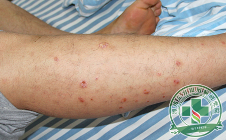 2、脓疱型牛皮癣:以四肢躯侧及皱襞处较多,皮损初发为在急性炎症红斑的基础上,出现多数密集针头至粟粒大小无菌性表浅脓疱,附有少量菲薄鳞屑。脓疱迅速增多,相互融合成大片脓糊状或成为环形红斑状,但其下又可再发新的脓疱,常因接触摩擦等外因,使脓疱破裂形成糜烂结痂。